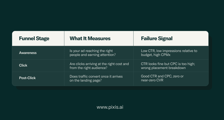 A funnel breaks at one point. CTR drops, or cost goes up, or clicks arrive and then disappear. Each signal points somewhere specific. When you know what to look at first, the diagnosis takes minutes, not days.