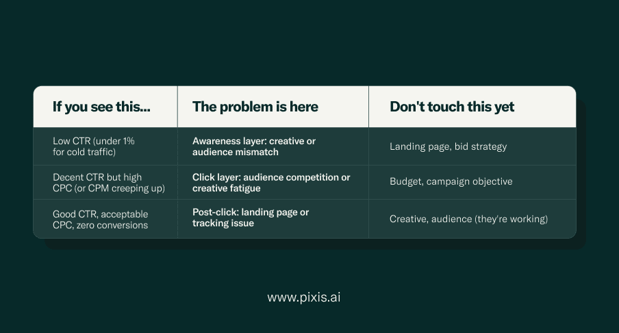 That’s the difference between a checklist and a diagnosis. If you want to see what that looks like against a real account, read how Pixis diagnosed why Facebook ads stopped performing for a live account.