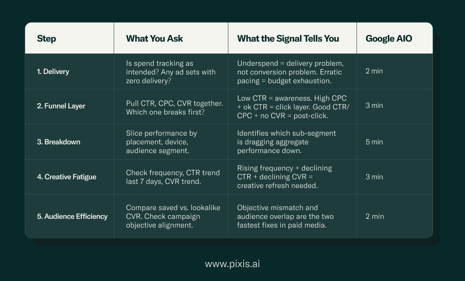 The fifteen minutes aren't spent checking things at random. They're spent reading the data in the right sequence: delivery first, funnel layer second, breakdown analysis third, creative fatigue fourth, audience efficiency fifth. Each step eliminates a category of cause. By the end, you know exactly what to fix.