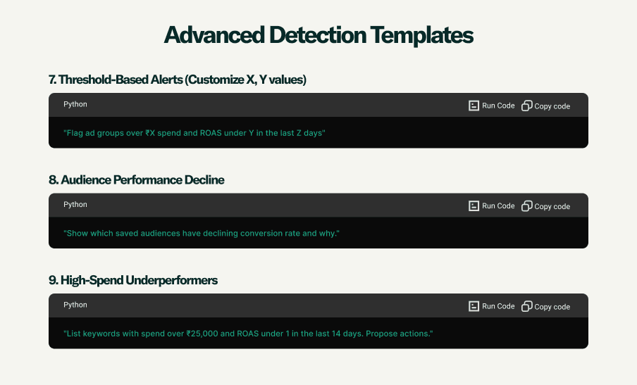 If you ask us :” What are the best query templates for catching ROAS drift early?’ Prism would show the following results